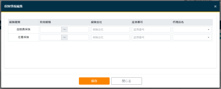 - 有効期限:保険の有効期限を入力してください。有効期限を設定すると更新手続き漏れを防ぐ為に、更新1カ月前から警告メッセージが表示されます。