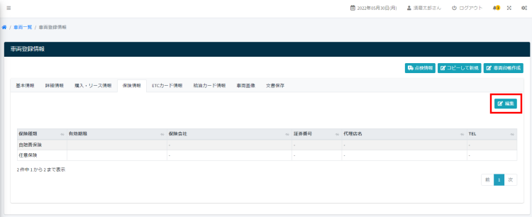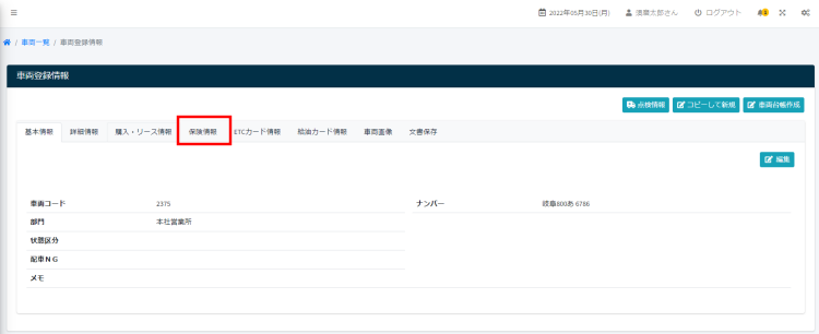- 車両登録情報が表示されたら、保険情報タブをクリックします。