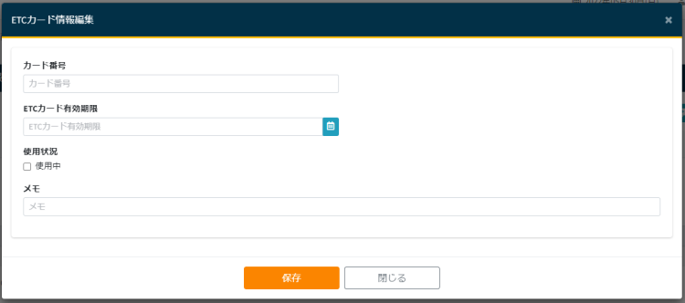 - ETCカード有効期限:ETCカードの有効期限を入力してください。有効期限を設定すると期限満了日の1カ月前から警告メッセージが表示されます。