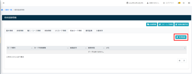 - 給油カード情報の右上にある新規登録ボタンをクリックします。