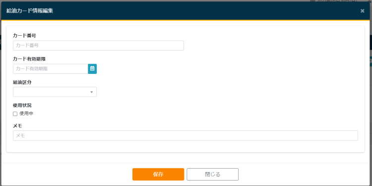 - カード有効期限:給油カードの有効期限を入力してください。有効期限を設定すると期限満了日の1カ月前から警告メッセージが表示されます。