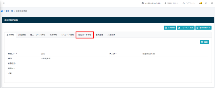 - 車両登録情報が表示されたら、給油カード情報タブをクリックします。