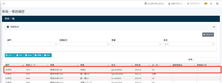 - サイドメニューの「車両管理」> 「車両・事故履歴」をクリックします。