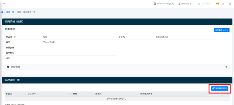 - 事故履歴一覧が表示されたら、事故履歴追加をクリックします。