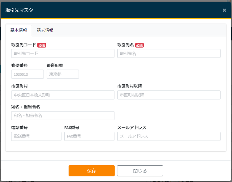- 取引先コード:必須項目です。取引先の識別番号を入力します。