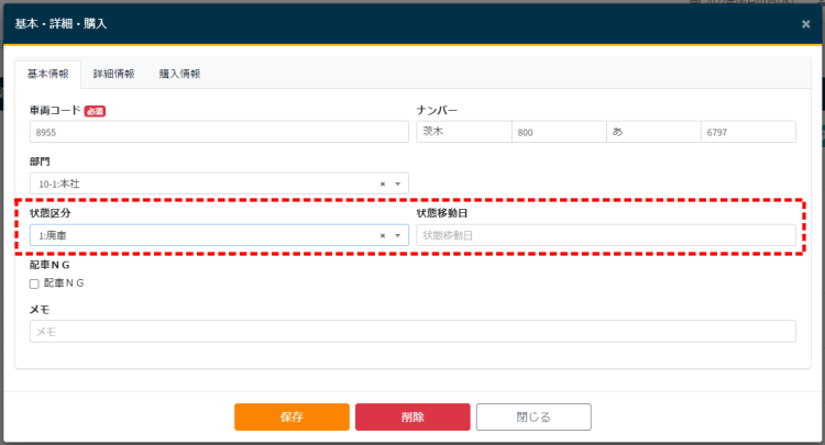 使い方ガイド 車両の設定 車両を売却・廃車した 1.車両の状態区分を変更 サイドメニューの「車両管理」> 「車両一覧」をクリックします。 車両一覧画面から該当車両をクリックします。 車両登録情報が表示されたら、画面右上の編集をクリックします。 車両登録情報(部署変更) 車両登録フォームが開きます。状態区分、移動日を編集して保存してください。 使い方ガイド, 車両の設定, よくある質問 売却, 廃車