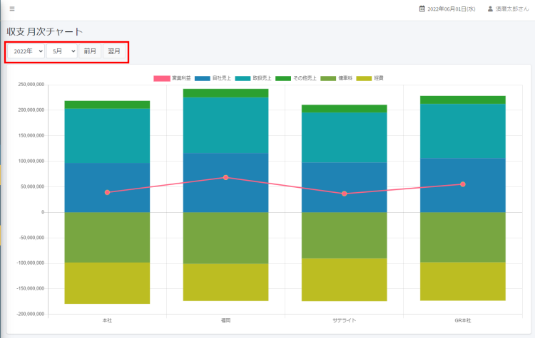 使い方ガイド 分析 収支を確認する(月次) 1.収支 月次チャートを表示する サイドメニューの「分析」> 「売上表」> 「月次チャート」をクリックします。 収支の月次チャートが表示されます。対象年月を設定します。 使い方ガイド, 分析 収支