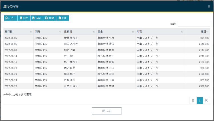 使い方ガイド 分析 車両別の運行の集計結果を確認する 1.車両別レポートを表示する サイドメニューの「分析」> 「売上表」> 「車両別レポート」をクリックします。 車両別レポートが表示されます。対象年月および受注部門を設定します。 初回はログインユーザーが所属している部門が自動的に選択されています。 部門を選択しない場合はすべての部門が対象となります。 運行の詳細が確認したい場合は、該当する車両をクリックします。 運賃の内容が表示されます。 使い方ガイド, 分析 車両, 運行集計