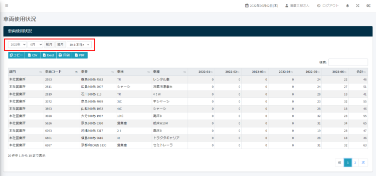 使い方ガイド 車両の設定 車両の使用状況を確認する 1.車両使用状況を表示する サイドメニューの「車両管理」> 「レポート」> 「車両使用状況」をクリックします。 車両使用状況が表示されます。 対象年月、部門を設定します。6カ月分の車両の運行回数の合計が表示されます。 使い方ガイド, 車両の設定 車両使用状況