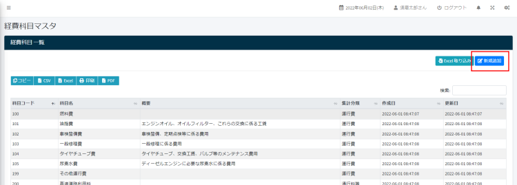 - 経費科目一覧画面の右上にある新規追加ボタンをクリックします。