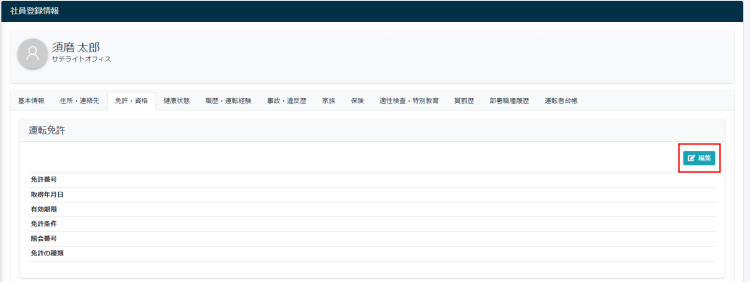 - 社員登録情報が表示されたら、免許・資格タブをクリックします。