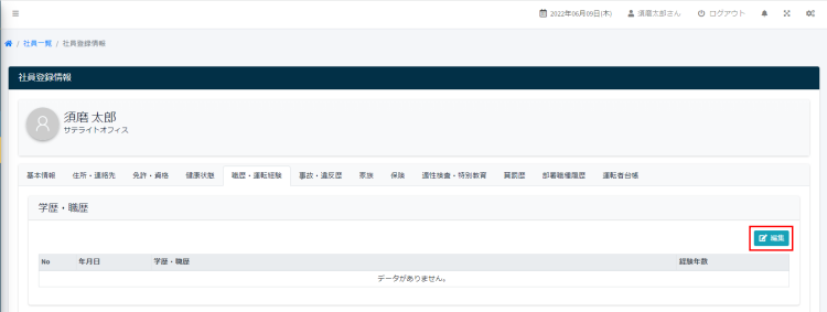 - 社員登録情報が表示されたら、職歴・運転経歴タブをクリックします。