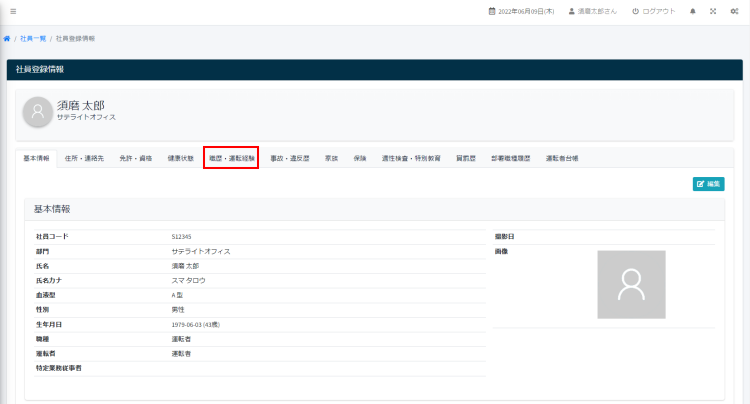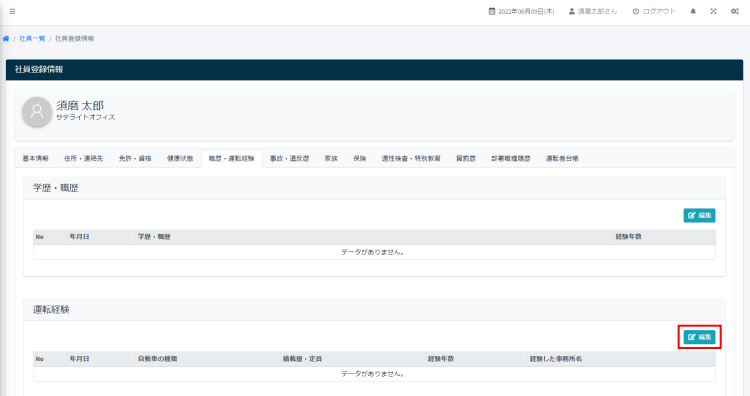 - 社員登録情報が表示されたら、職歴・運転経歴タブをクリックします。