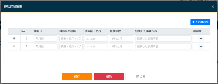- 経験した事業所名:対象の運転業務を経験した事業所名を入力します。
