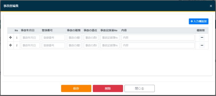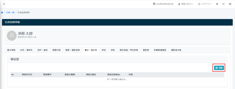 使い方ガイド 社員の設定 事故歴の追加 目次 1.事故歴編集フォームの表示 2.事故歴の編集 1.事故歴編集フォームの表示 サイドメニューの「社員管理」> 「社員一覧」をクリックします。 社員一覧画面から該当する社員をクリックします。 社員登録情報が表示されたら、事故・違反歴タブをクリックします。 事故歴の編集ボタンをクリックします。 事故歴編集フォームが開きます。 2.事故歴の編集 必要事項を入力し、保存ボタンをクリックします。 ※入力欄が足りない場合は、画面右上の入力欄追加をクリックしてください。 使い方ガイド, 社員の設定 事故歴, 社員