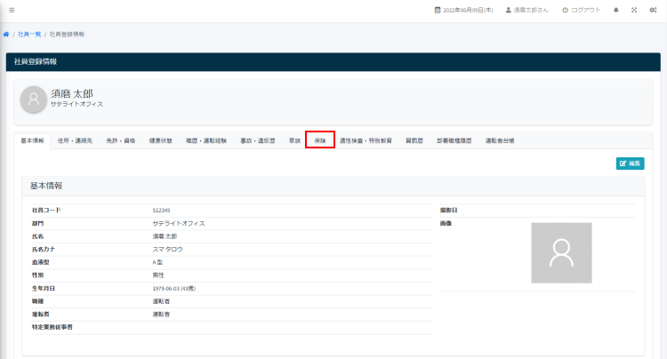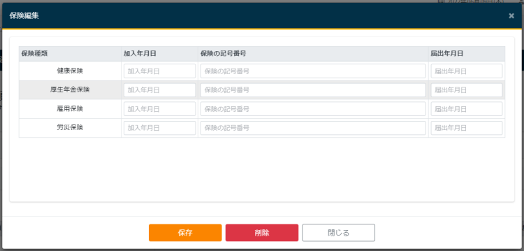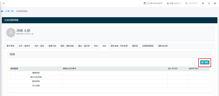 使い方ガイド 社員の設定 保険情報の追加 目次 1.保険編集フォームの表示 2.保険の編集 1.保険編集フォームの表示 サイドメニューの「社員管理」> 「社員一覧」をクリックします。 社員一覧画面から該当する社員をクリックします。 社員登録情報が表示されたら、保険タブをクリックします。 保険の編集ボタンをクリックします。 保険編集フォームが開きます。 2.保険の編集 必要事項を入力し、保存ボタンをクリックします。 使い方ガイド, 社員の設定 保険, 社員