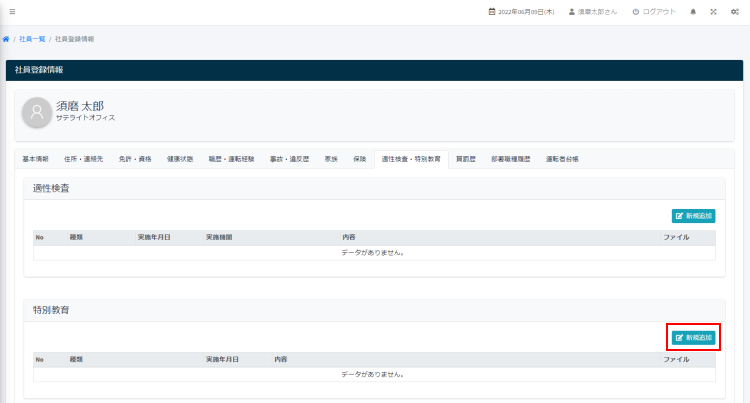 - 社員登録情報が表示されたら、適正検査・特別教育タブをクリックします。