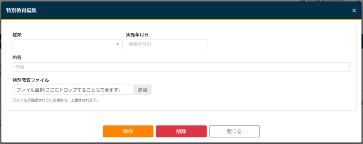 - 特別教育ファイル:ファイルを登録します。参照を押してファイルデータを選択するか、もしくはドラッグ&ドロップでも登録できます。ファイルサイズは、5MBまでにしてください。