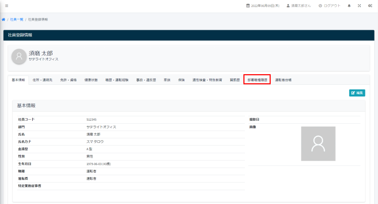 - 社員登録情報が表示されたら、部署職種履歴タブをクリックします。