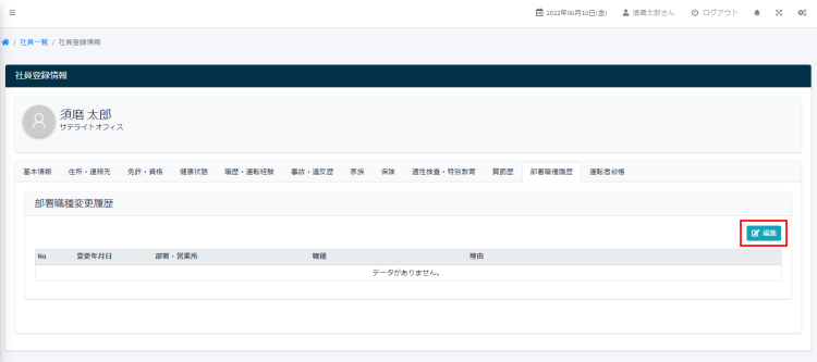 - 部署職種変更履歴の編集ボタンをクリックします。
