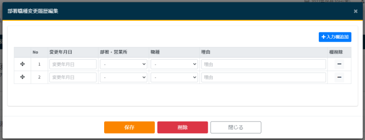 社員の部署や営業所の異動、職種の変更などを履歴管理できます。