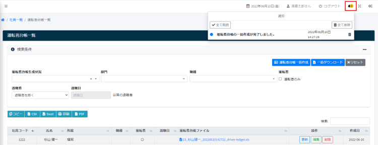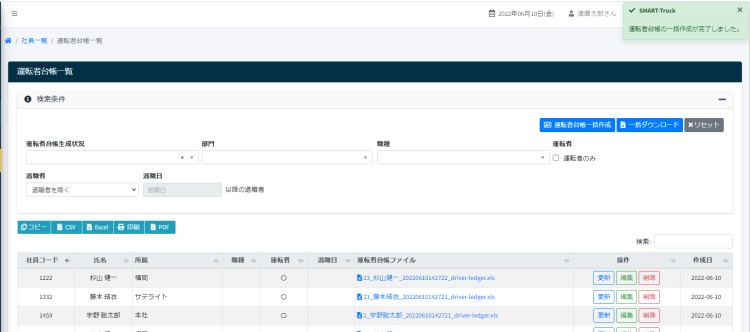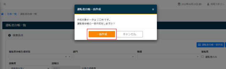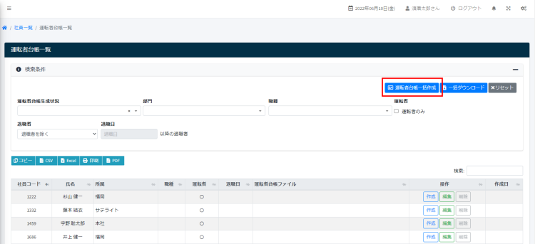 - 運転者台帳一覧画面が表示されたら、画面右上の運転者台帳一括作成をクリックします。