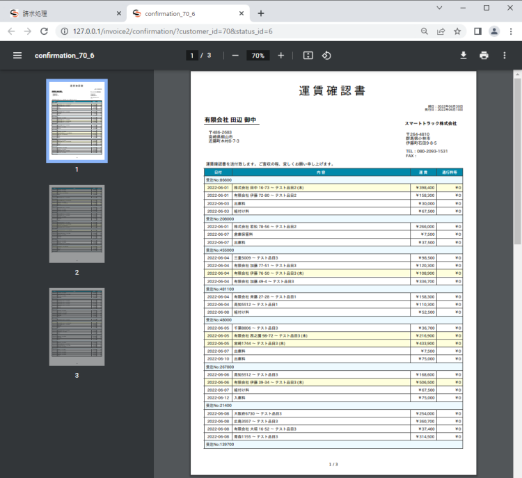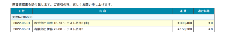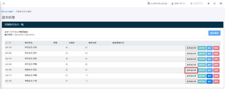使い方ガイド 請求・支払処理 運賃確認書を作成する 1.運賃確認書を作成する サイドメニューの「請求・支払処理」> 「請求処理」をクリックします。 締め日の選択画面が表示されたら、処理対象の締め日のデータをクリックします。 対象取引先の一覧が表示されたら、運賃確認書をクリックします。 運賃確認書が表示されます。 ※運賃が未確定の場合は、明細行の背景色が黄色で表示されます。 使い方ガイド, 請求・支払処理, よくある質問 運賃確認書