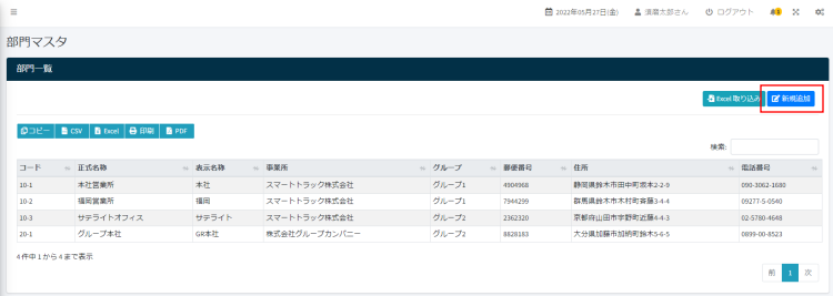 - 部門一覧画面の右上にある新規追加ボタンをクリックします。
